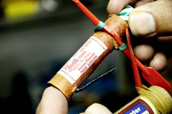 Bob Gerau of Columbia shows vintage explosive as part of his firework collection. Gerau has been collecting for about 9 years and keeps his private collection in glass cases.